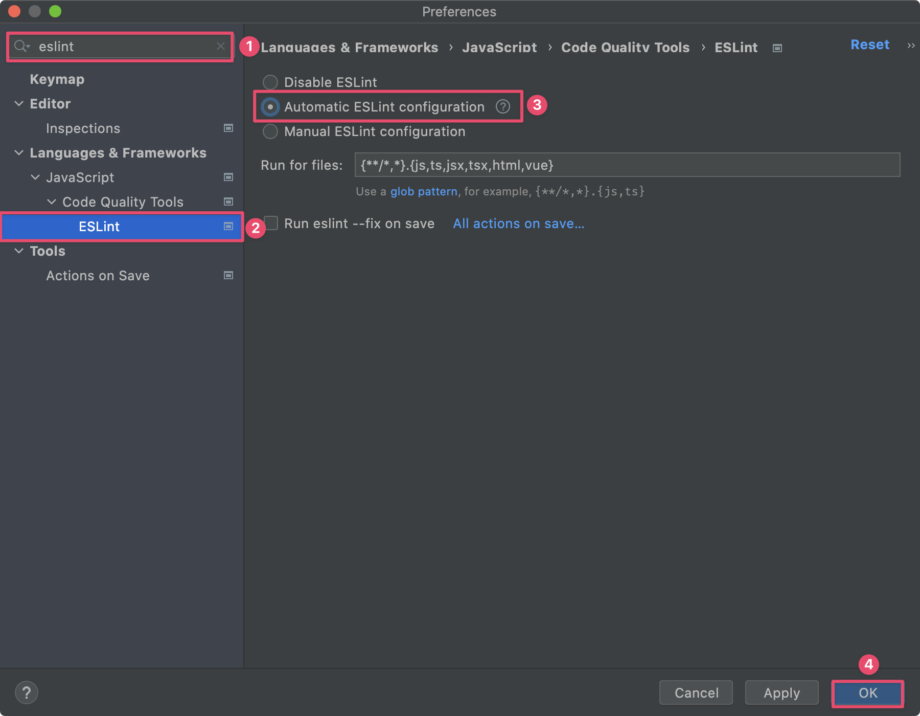 WebStormは、ESLint統合機能がデフォルトで入っているので、プラグインなどをインストールする必要はありません。ESLintを有効にするには、「Preferences」を開き、検索に「eslint」と入力します(①)。絞り込まれたメニューから「ESLint」を開きます(②)。「Automatic ESLint configuration」にチェックを入れます(③)。最後に「OK」を押すと設定完了です(④)。